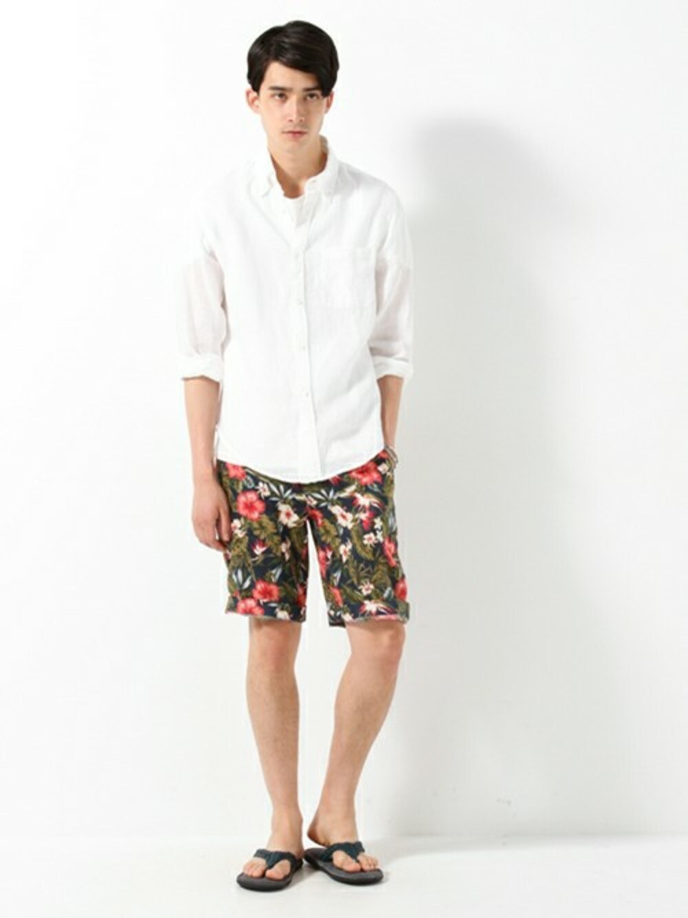 ホワイトストライプシャツに、花柄ショーツが相性の良いスタイリング。レザーサンダルをチョイスし、男らしさを強調しました。
