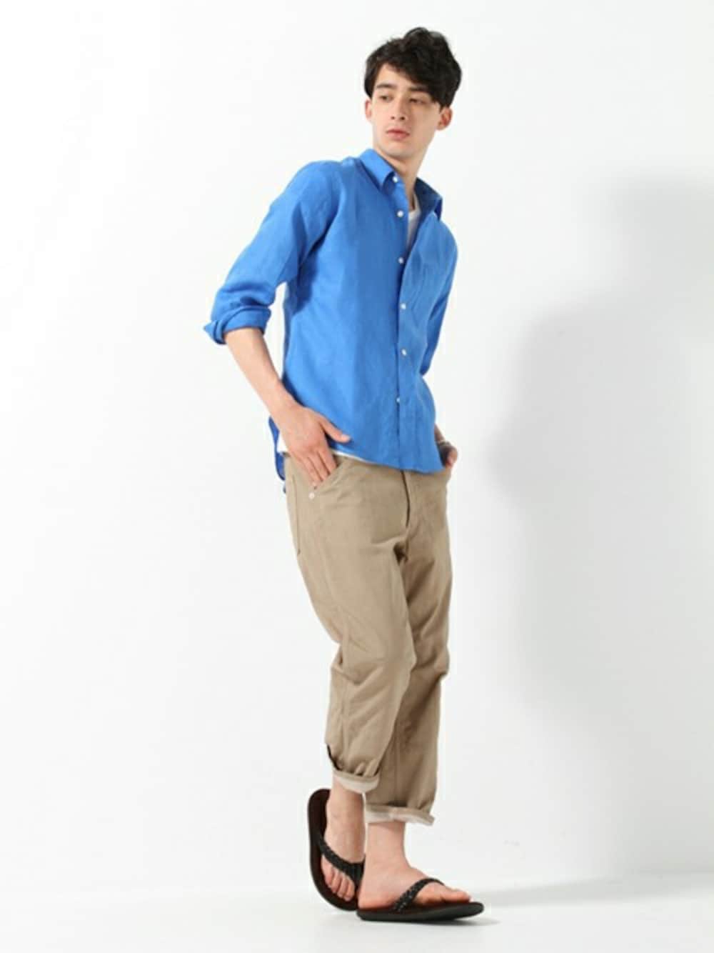 発色の良いコバルトブルーシャツに、ベージュパンツが相性のよいスタイリング。ブラックサンダルが足元の印象を引き締めます。