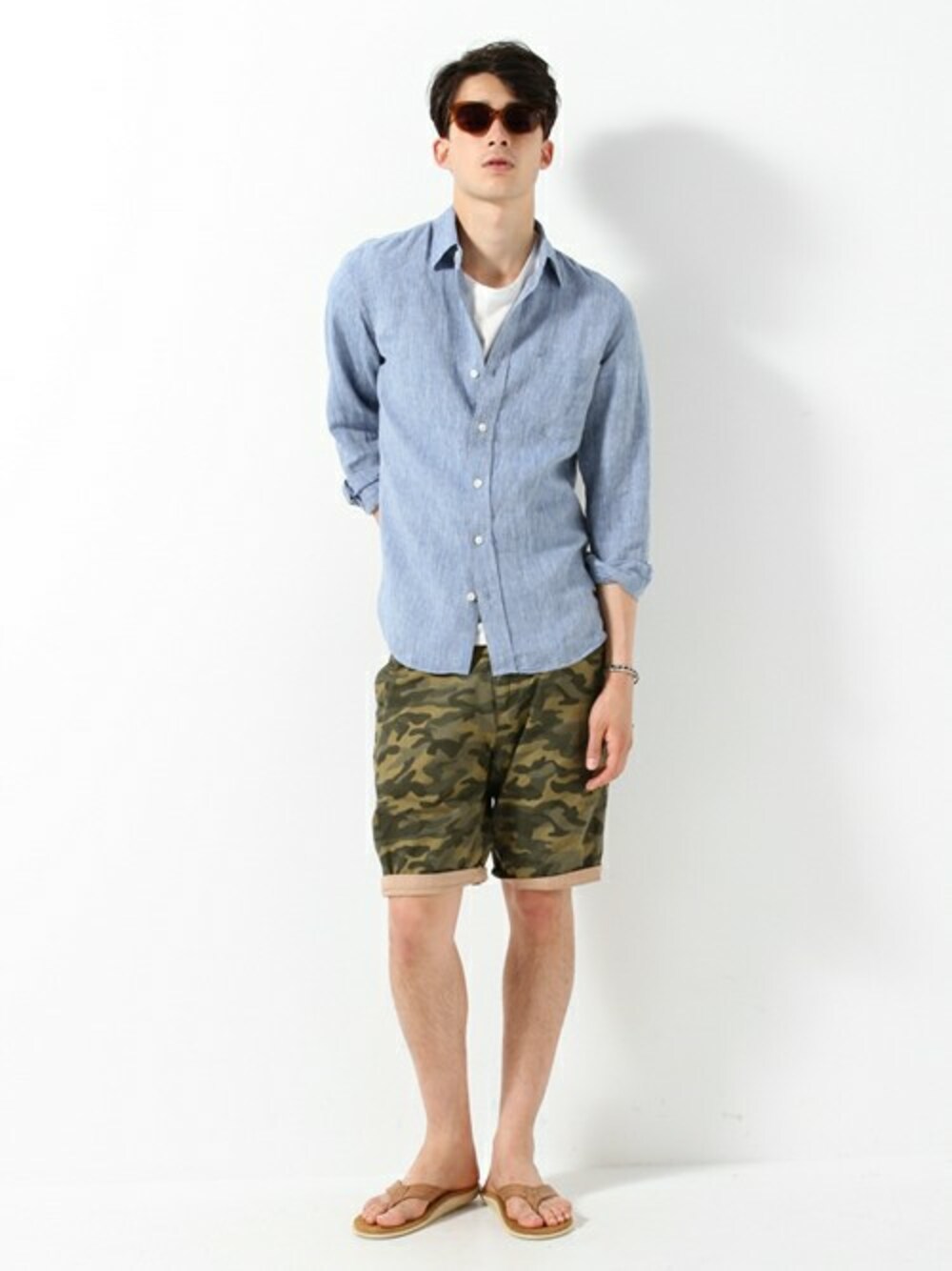 ライトブルートーンシャツに、カモフラショーツを合わせ夏の男をイメージしました。サングラスをチョイスすることで、全体のイメージを引き締めます。