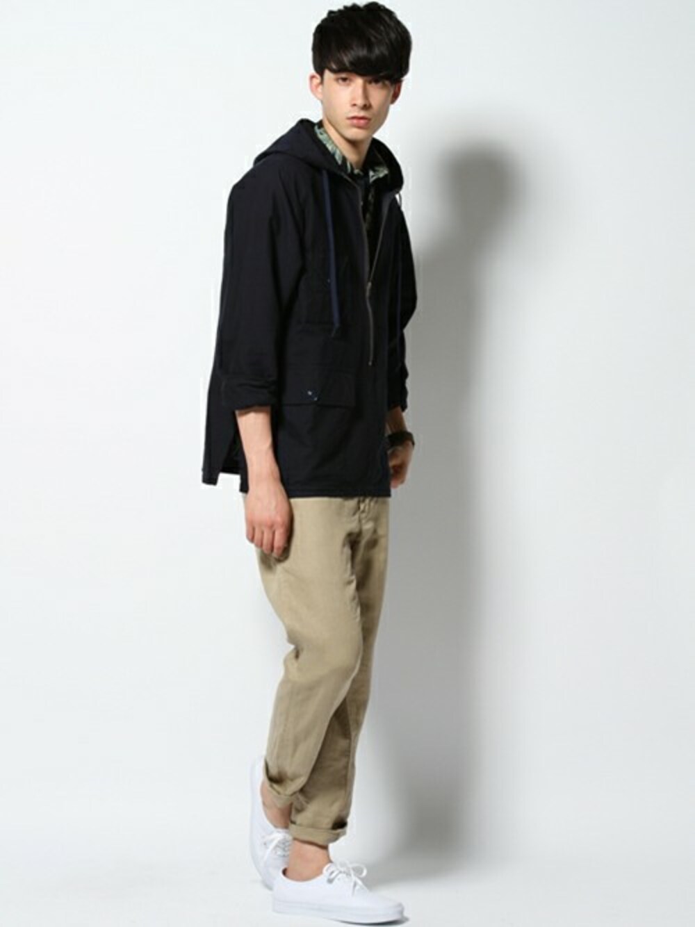 カラードオックスフードプルオーバージャケットにベージュパンツを合わせ、メリハリのあるコーデに仕上げました。