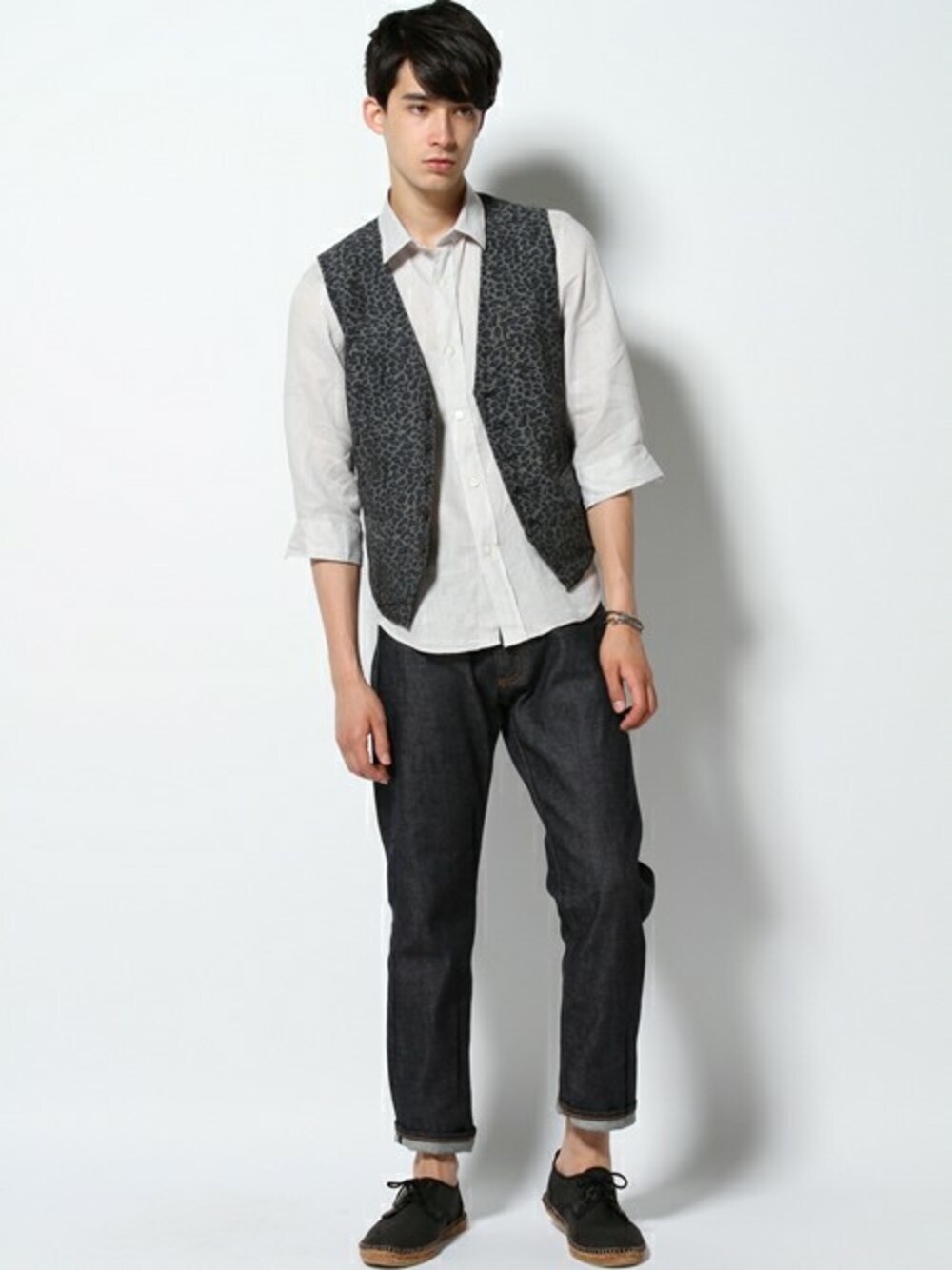 レオパード柄ベストと、ダークトーンのデニムが落ち着いた雰囲気のコーデです。