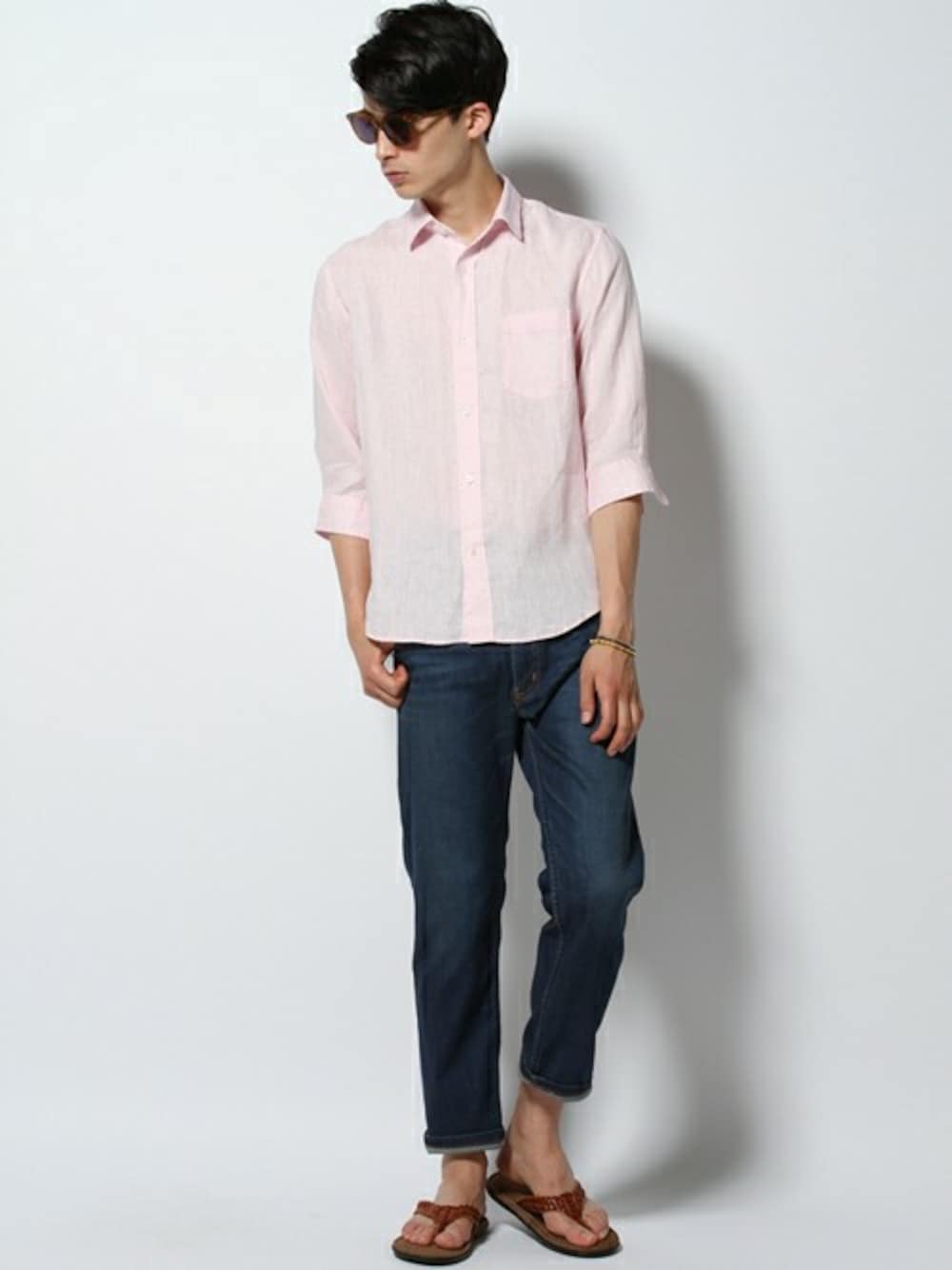 ピンクリネンシャツに、デニムパンツを合わせさわやかさを演出したコーデです。
