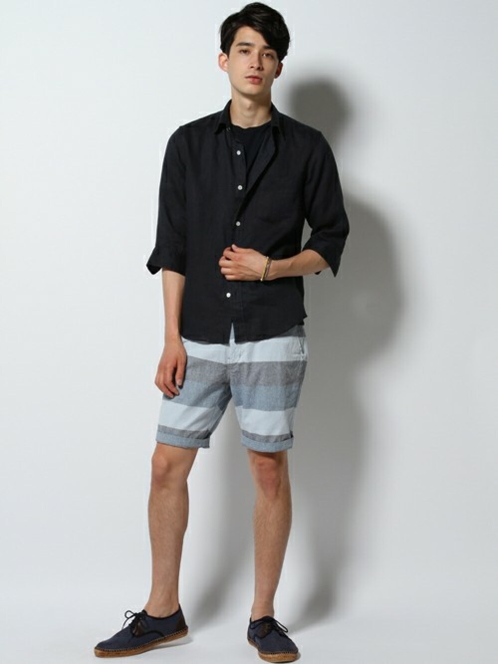 ダークネイビーリネンシャツに、ボーダーショーツを合わせメリハリをつけたスタイリングです。
