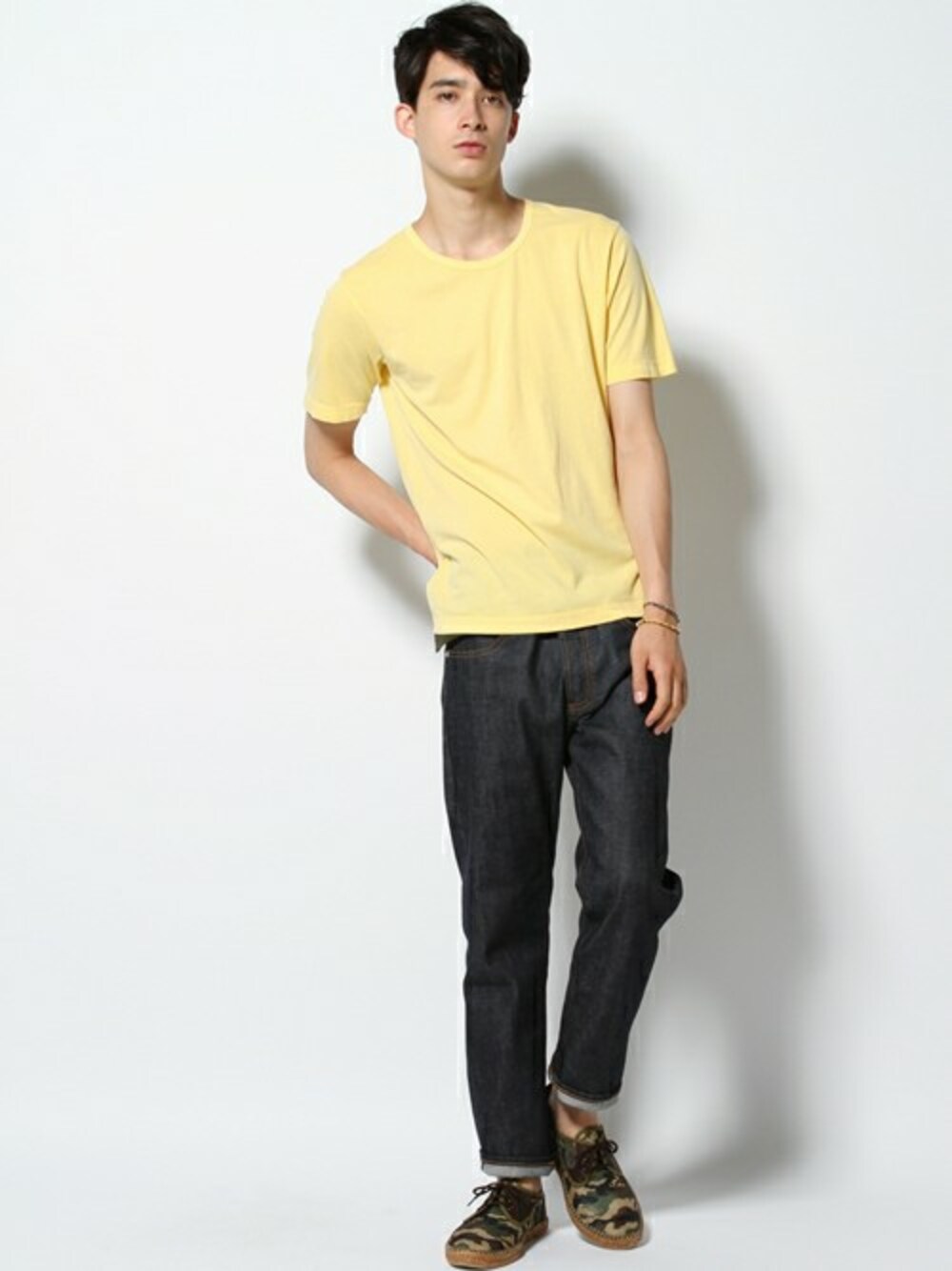 イエロー無地Tに、デニムを合わせ、シンプルなコーデに。カモ柄ジュート巻シューズがポイントとして引き立ちます。