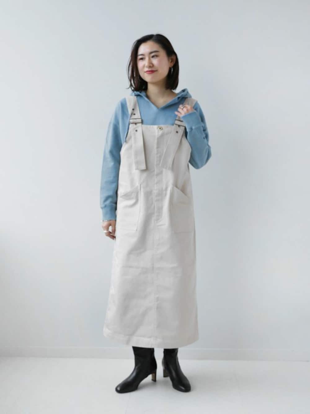 ホワイト×水色で春を意識しました。 メンズライクに着られるジャンパースカートなので あえてヒールがあるブーツを合わせて女性らしさをプラスしました。 インナー次第でオールシーズン着られる便利なアイテムです◎ ********************** 身長:160cm/普段サイズ:M/着用サイズ:FREE サイズ感:フロントにジップがついていて着脱が楽ちんです。 素材感:ハリ感がある生地で、しっかりとしています。 着心地:ゆとりがあるので動きやすく、厚手のインナーも合わせられます。 **********************