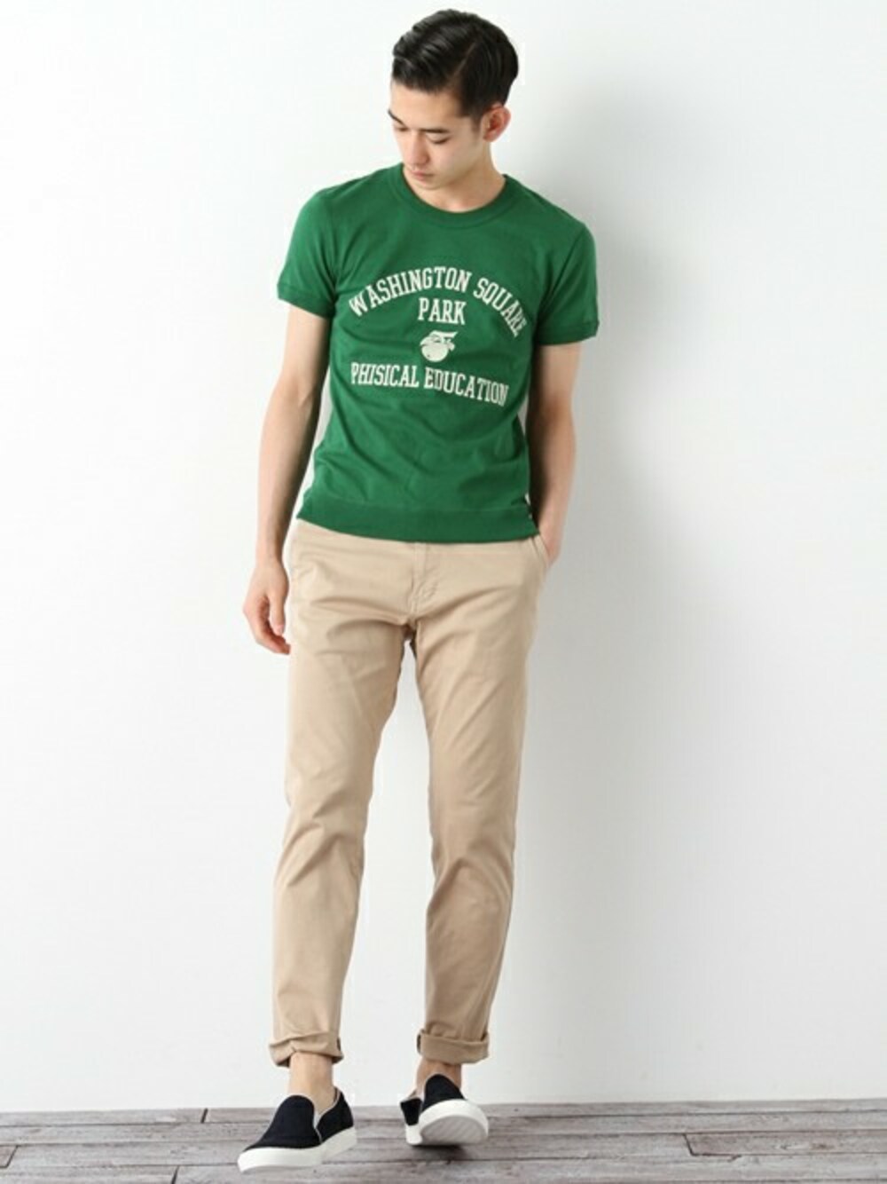 定番チノにスウェードのカラースリッポンを合わせた、爽やかアメカジコーデ。夏のスタイリングにオススメです。