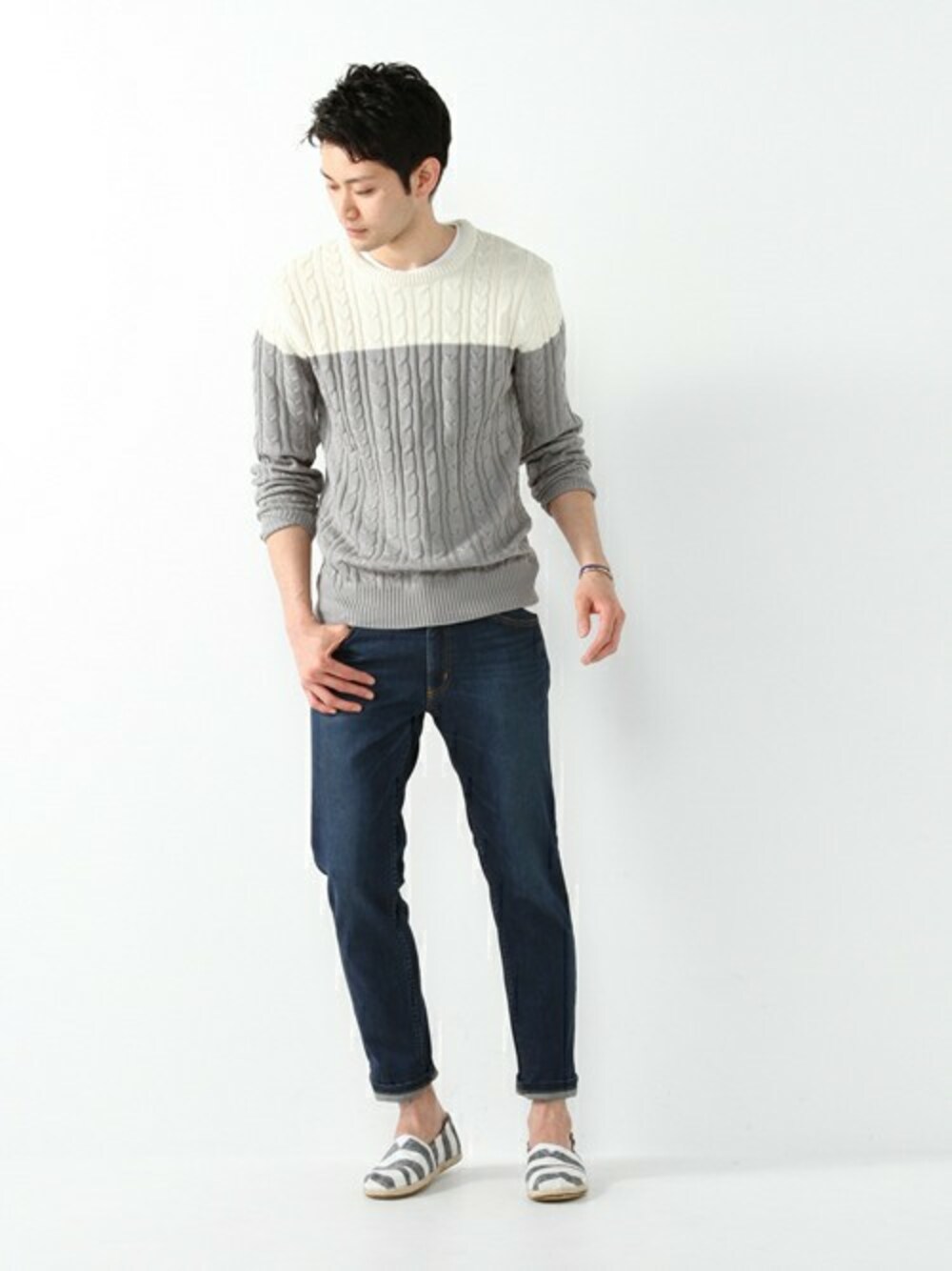 さわやかな夏らしいホワイト×グレーのニットに細身のストレッチデニムを合わせ、2トーンニットが際立つスタイリングです。