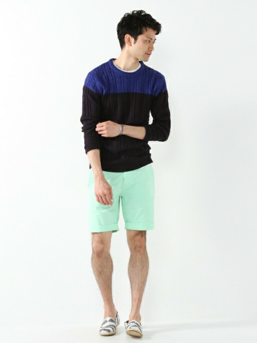 伸縮性のある色鮮やかなショーツに、2トーンニットでメリハリ感をプラスしたスタイリングです。