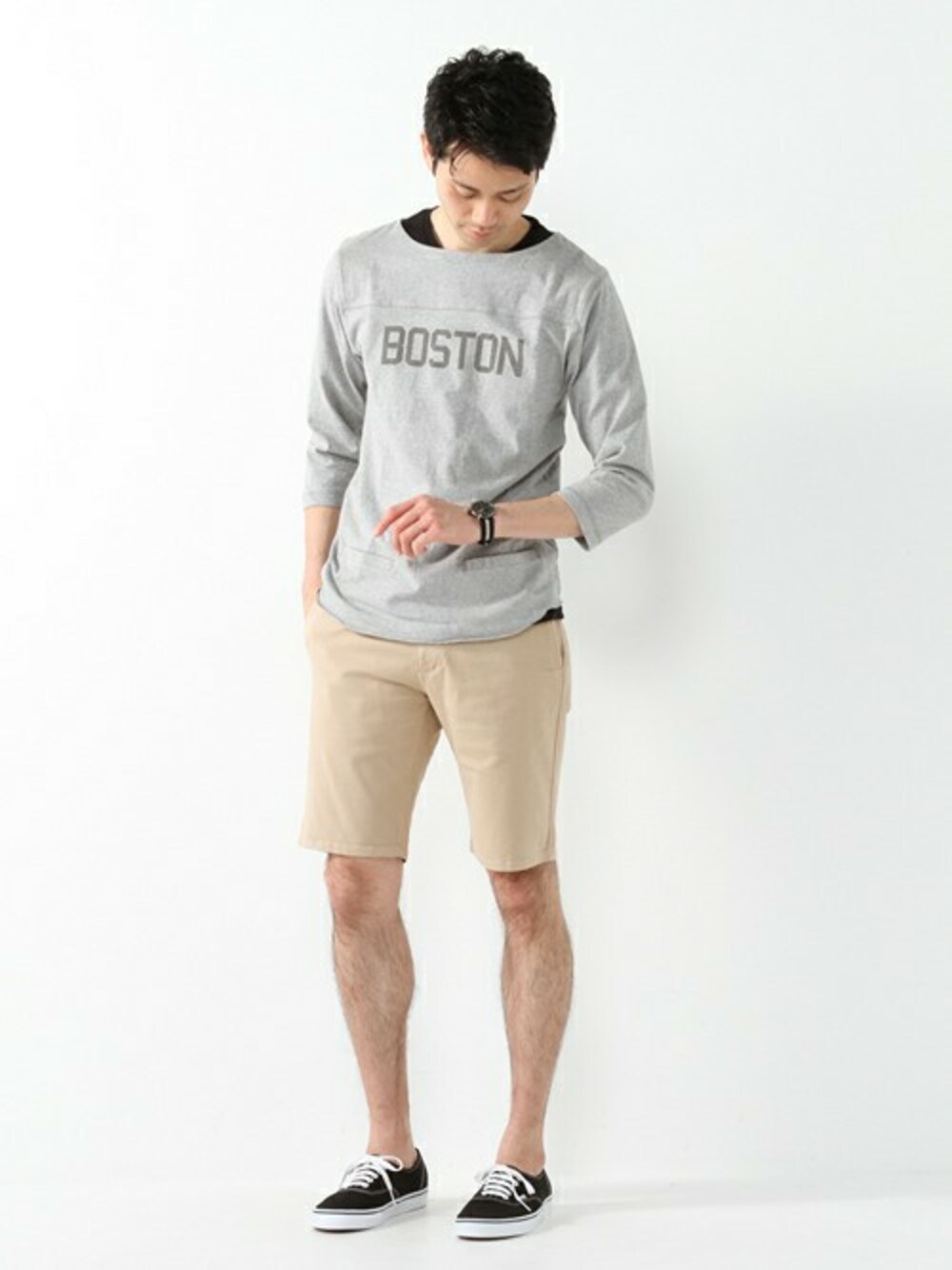 ポケット付きプリントカットソーに、風合いのある伸縮性抜群のベージュショーツを合わせたトレンド感のあるスッキリスタイリング。