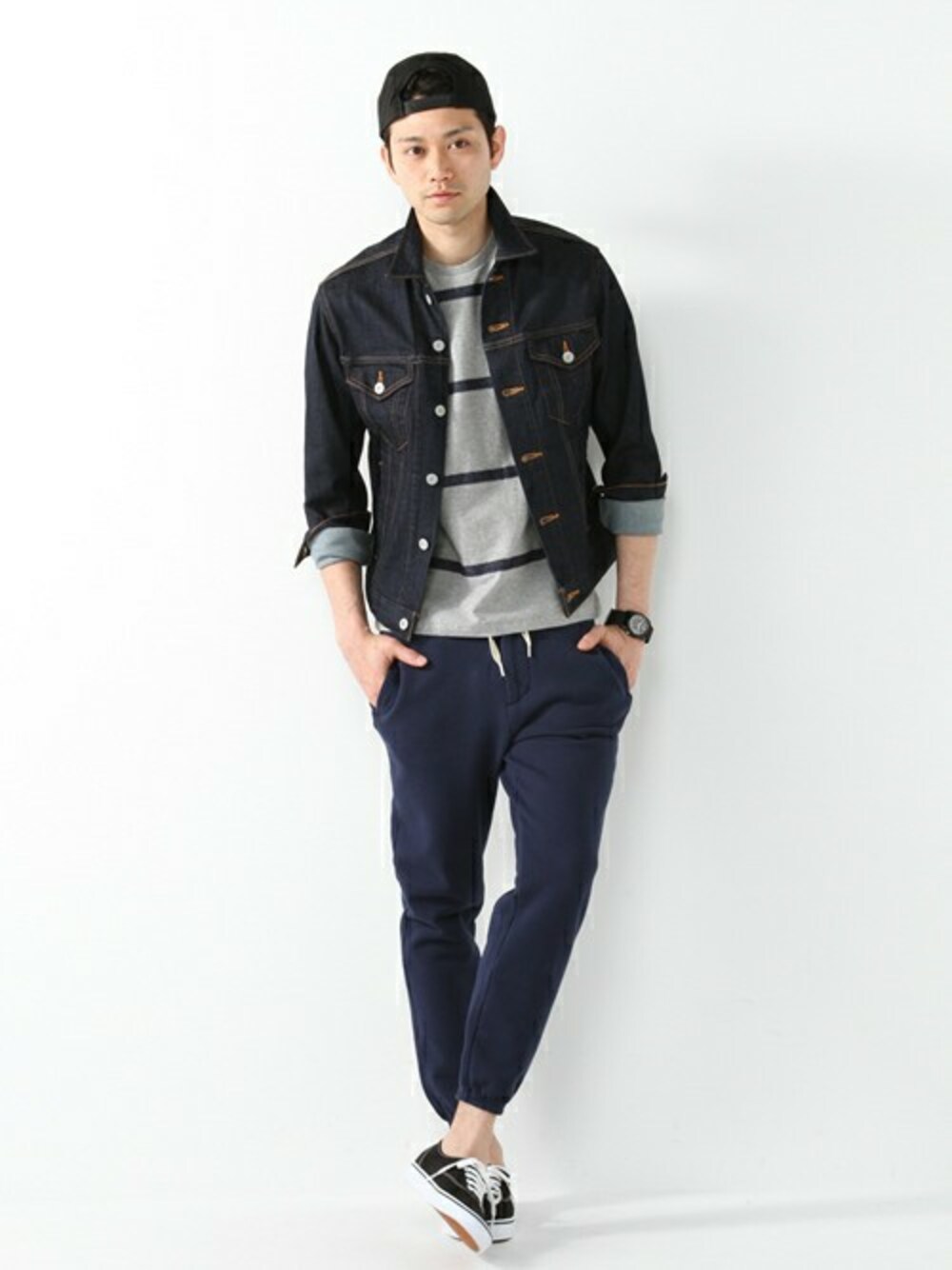 スエットパンツ、スニーカー、キャップと、トレンドを意識しながら、デニムジャケットをはおりメリハリ感を演出したスタイリング。