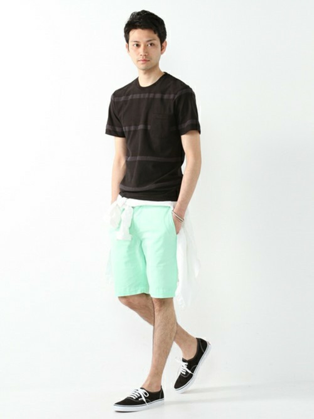 発色の良いショーツに、ダークトーンボーダーTシャツが新鮮なスタイリング。スニーカーがトレンド感と抜け感を演出。