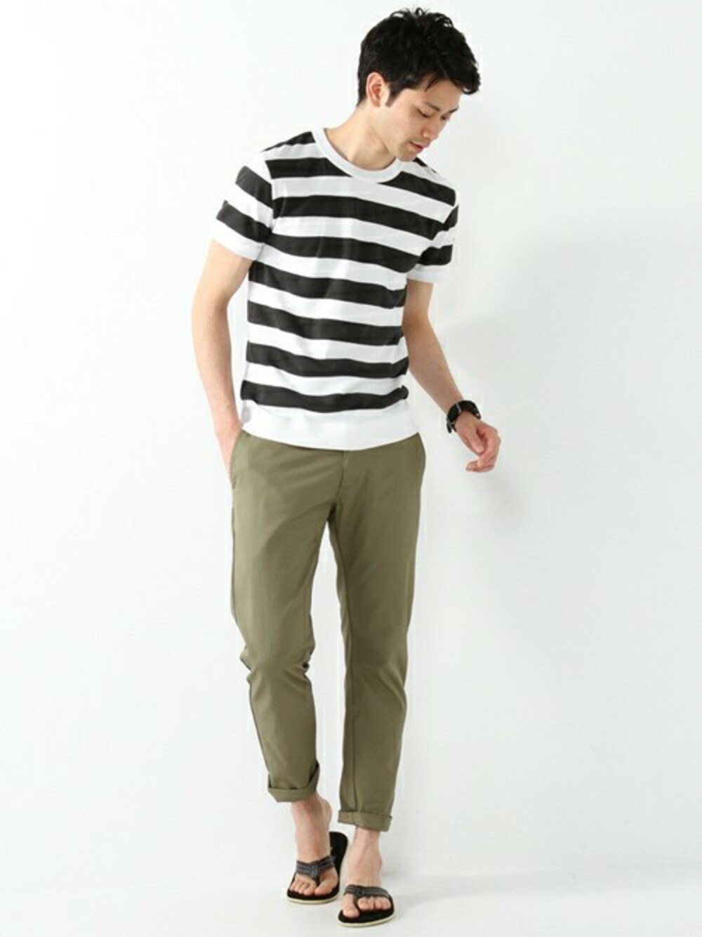 ホワイト×ブラックのボーダーTに、ツヤ感のあるカーキパンツを合わせ、大人な夏を演出したスタイリング。