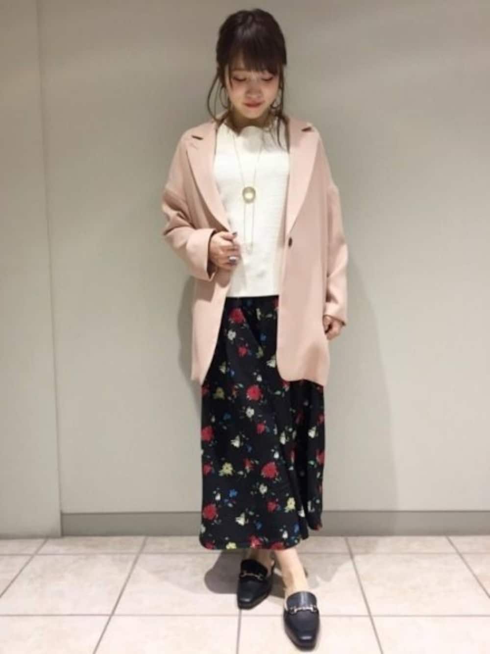 淡いピンクベージュに黒のボトムを組み合わせジーナシスらしい春コーデに! 絶妙な丈感のアウターなので、ボトムを選ばず着ていただけます☆