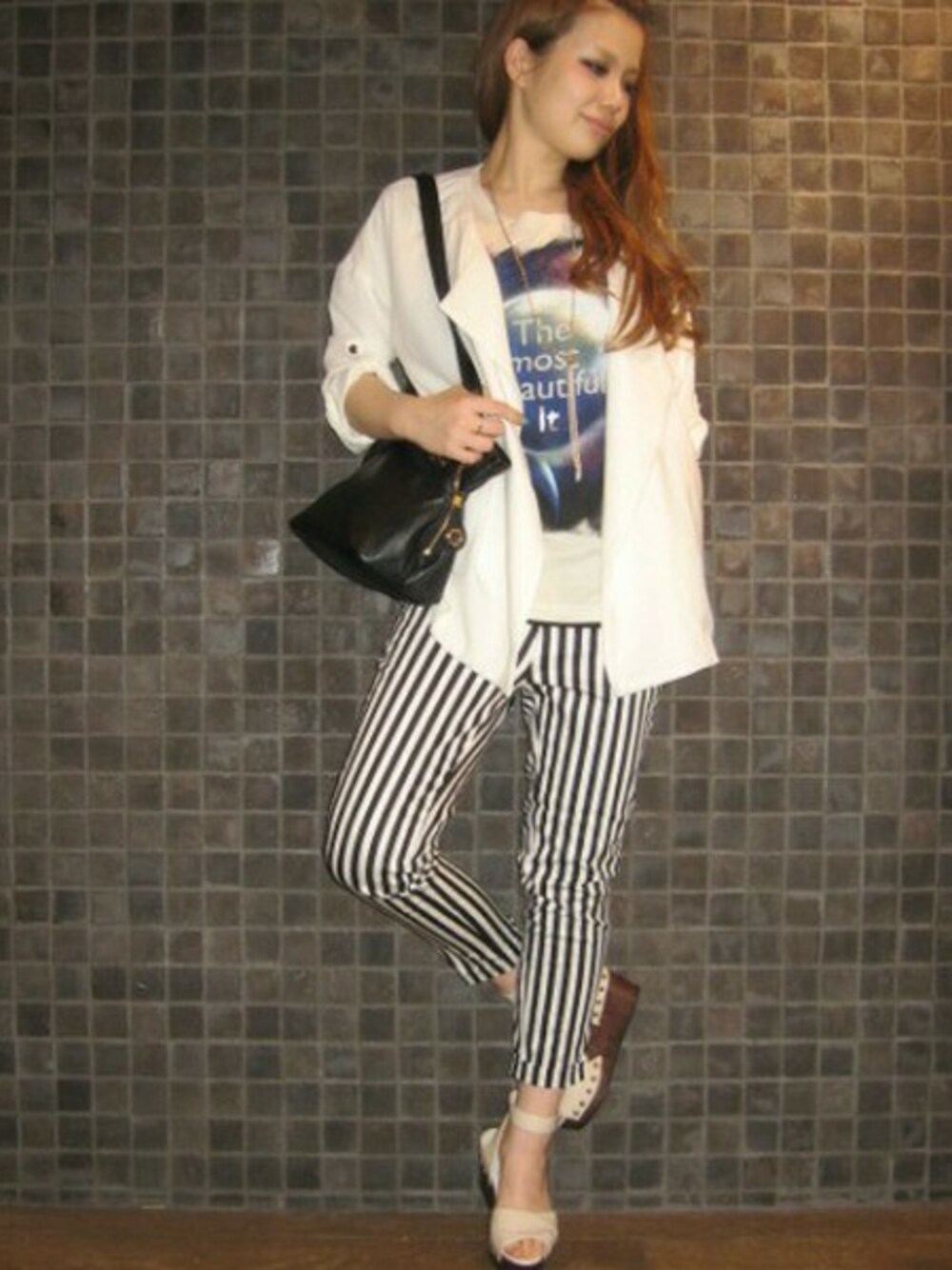 今年はストライプが大大流行していますよね?♪そんなストライプのアイテムもプリントTシャツに白ジャケットで合わせることでCOOLに決まります★☆!小物も白と黒で統一することでジーナシスっぽく、、♪是非ストライプにチャレンジしてみてください!!♪