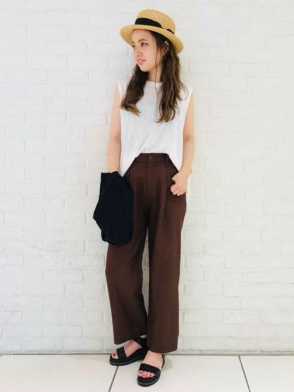 夏の大人リラックススタイルです☆ 今年はワイドパンツにフラットなサンダル合わせが気分♪ カンカン帽など遊び心もプラスしました!