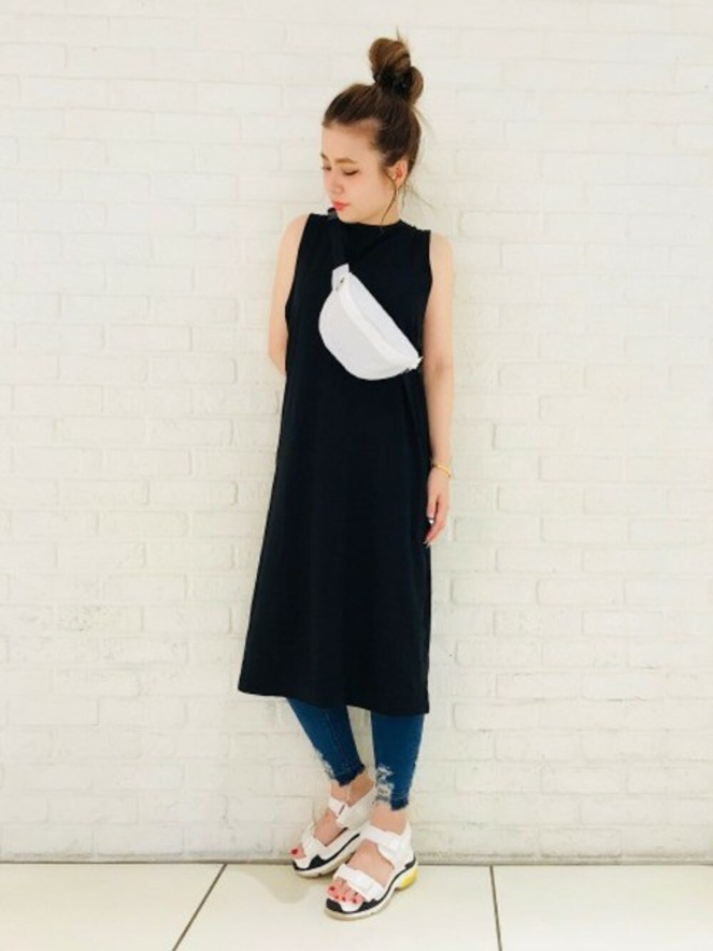 バックスタイルがポイントのノースリーブにスポーツサンダルを合わせて スポーツMIXコーディネート★ 今年トレンドのスポーツサンダルは、さりげなく挿し色ができてプラスするだけでグッと今年らしい印象に♪