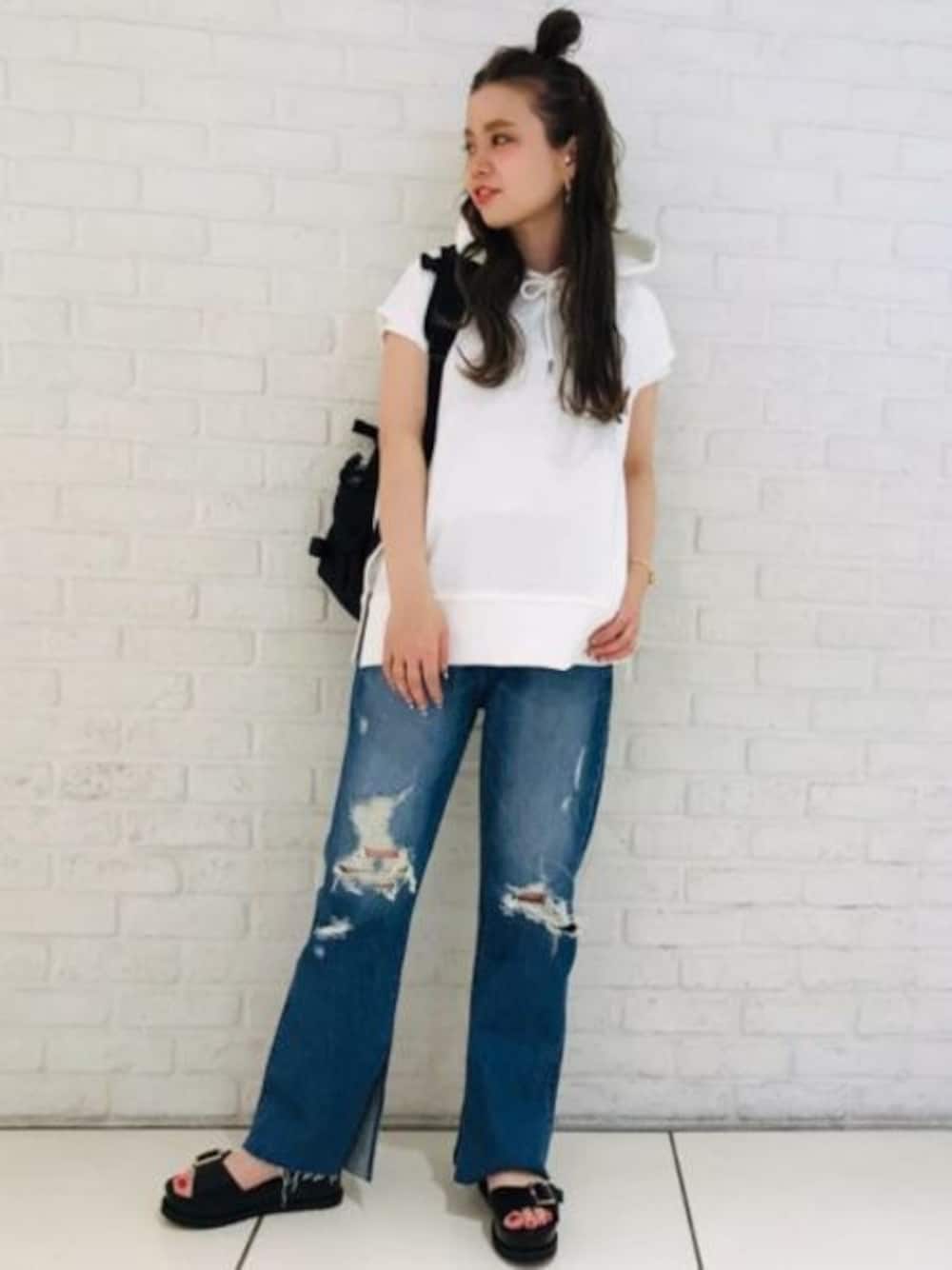 人気のフーディをデニムとサンダルでシンプルなスポーツMIXコーディネートで☆
