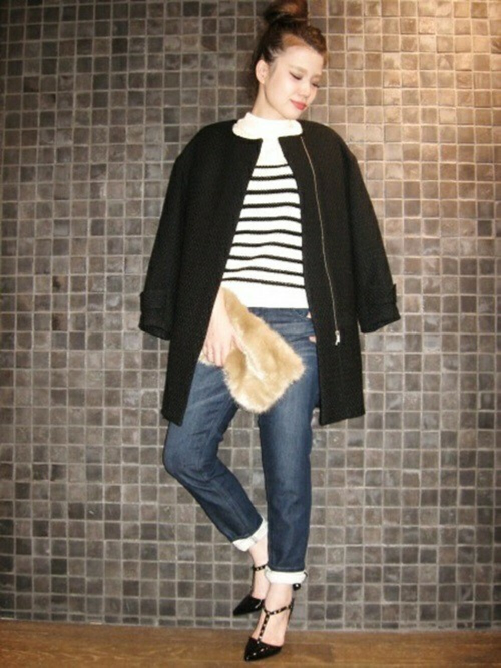 ボーダー×デニム カジュアルなコーディネートを ノーカラーコートとヒールで合わせて レディライクに仕上げました♪