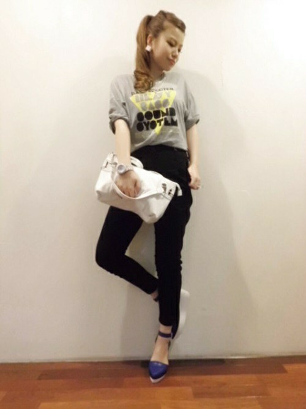 ロゴがかわいいTシャツを主役に、シンプルにコーディネートしました★ カジュアルなTシャツも、ハイライズ+ヒールを合わせると一気に大人っぽい雰囲気になります!