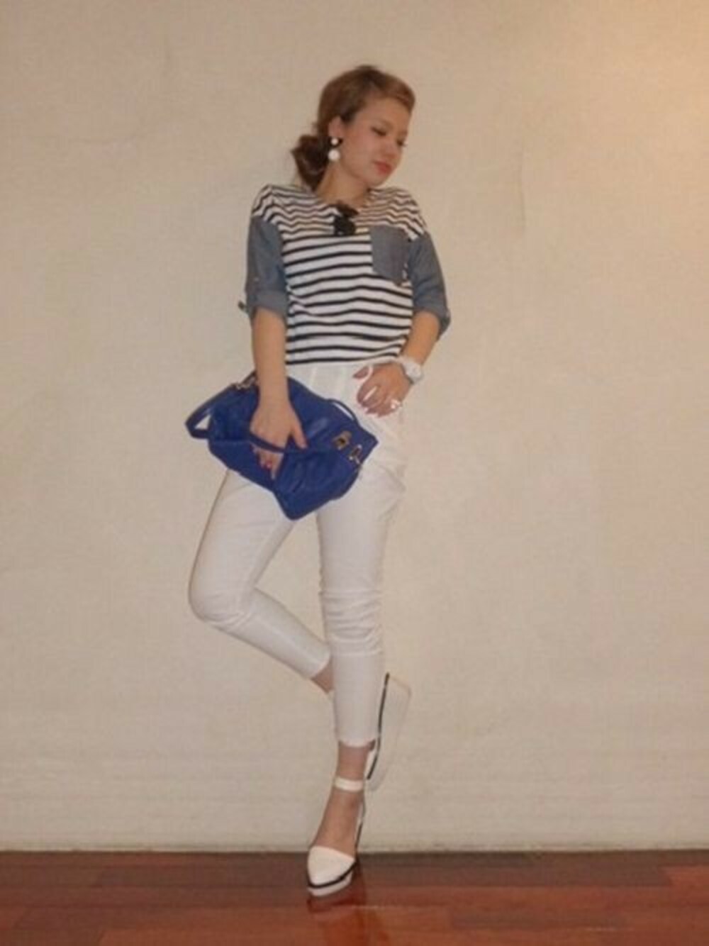 ボーダー×ホワイトボトムでマリンスタイルに★ トップスはカットソーとシャツのコンビ素材なので、シンプルコーデでもおしゃれに決まります!!