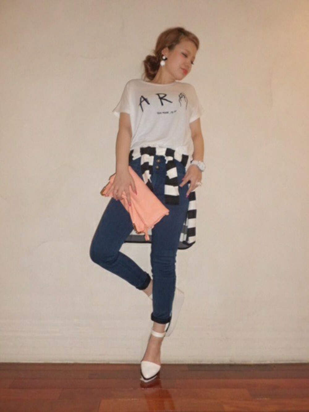Tシャツ×デニムは、カジュアルになりすぎないようヒールアップがマストです! クラッチバッグとウエストマークで更にスタイリッシュに仕上げました★