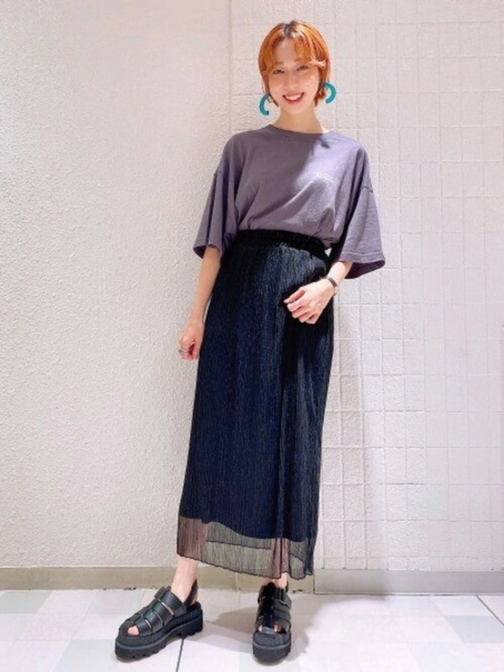 バックプリントTEE×スカートでカジュアルコーデに♪ スカートに透け感があるので、プリントTEEと合わせてもカジュアルに なり過ぎずに来ていただけます! カジュアルな中に程よい肌見せが◎