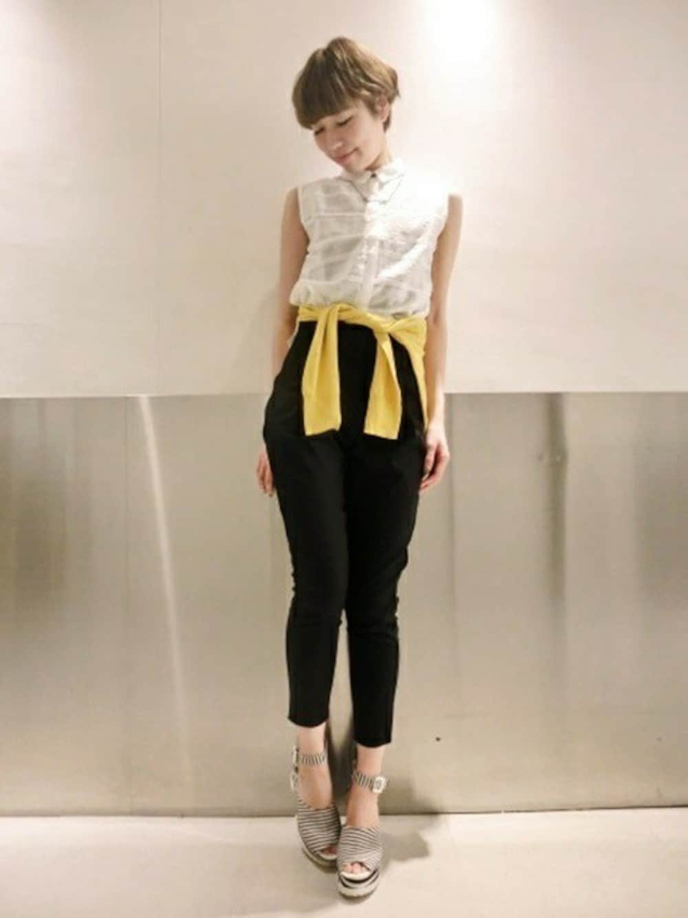 ジャガード×レースの春らしいシャツは、縦ラインを生かしてすっきりパンツでまとめてみました! モノトーンなので、明るい黄色をさして元気な印象に★
