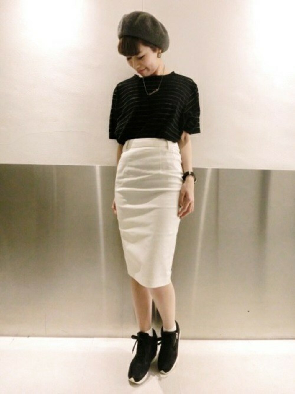 トレンドの膝丈ペンシルスカートは、敢えて主役にさせて他はシンプルに♪ トップスをINして長めの丈をしっかり見せれば脚長効果バッチリです!! スニーカーや厚底シューズで足元はカジュアルにするとより今年らしいです!