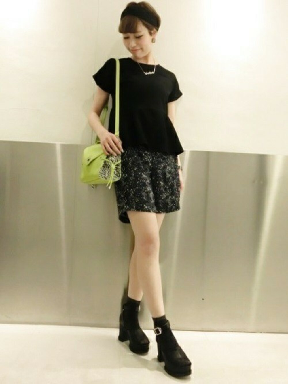 今季注目のぺプラムプルオーバーは、スタイルアップ効果も抜群です♪ モノトーンコーデなので、バッグのネオンイエローをアクセントにしました☆