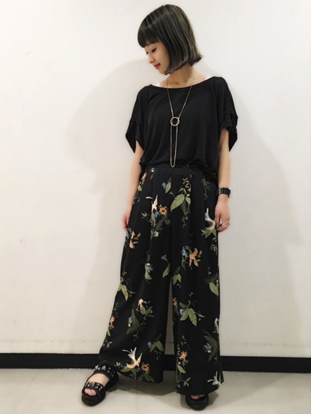 柔らかい素材のトップスはこれからの時期にも着心地◎肩まわりの落ち感が綺麗に出ます! オールブラック合わせも柄を入れることで夏らしく鮮度アップに☆