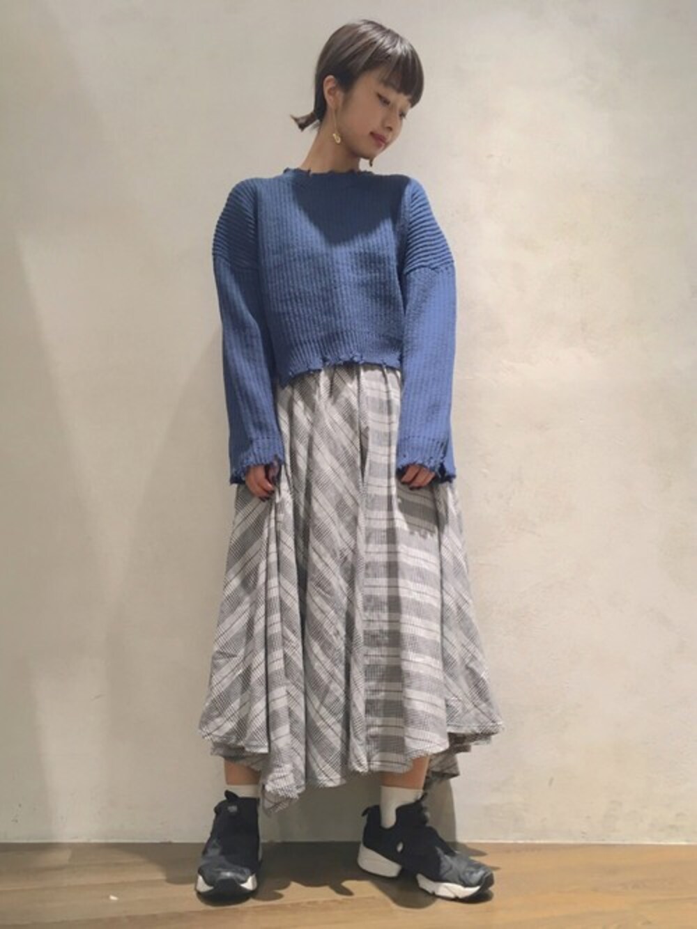 クラッシュのニットは短めの丈で合わせやすさ◎ 広がるボトムにもINせずそのまま着ていただけます!