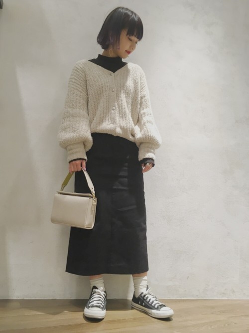 柔らかい生地のカーディガンは着心地◎ バルンスリーブ×タイトスカートでメリハリのあるスタイリングにしました☆