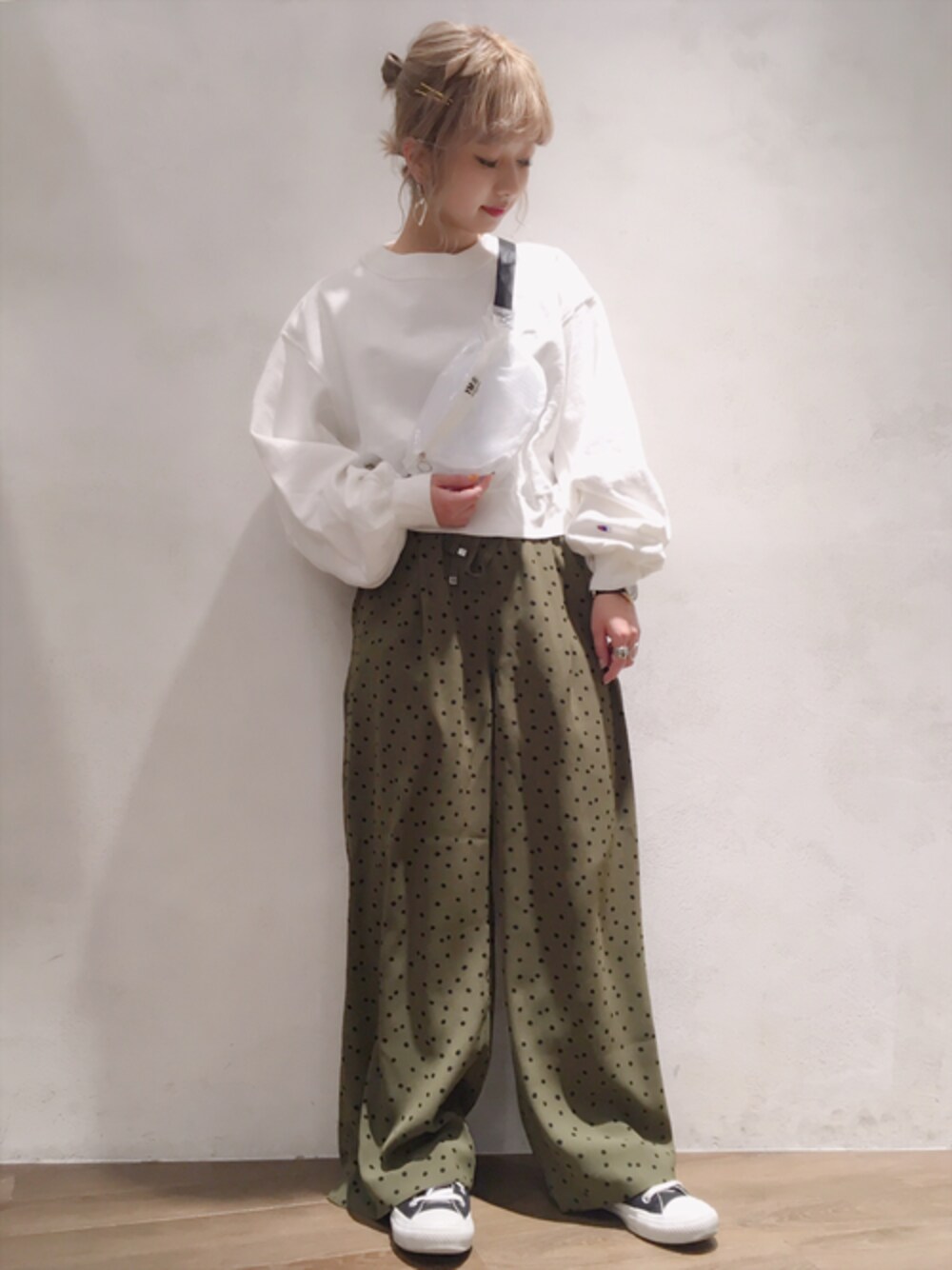 白×カーキで軽さを出したスタイリング☆ トレンドのスポーティなアイテムでまとめました!