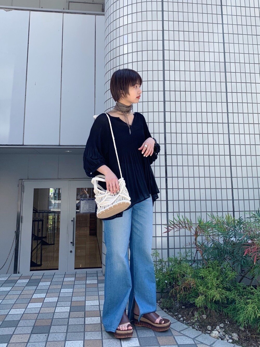 インスタID mari.yama.0203 甘めのボリューム袖ブラウスは デニムパンツで合わせて甘辛に☺️ このデニムパンツは脚が長く見えて とってもオススメです👀❤️