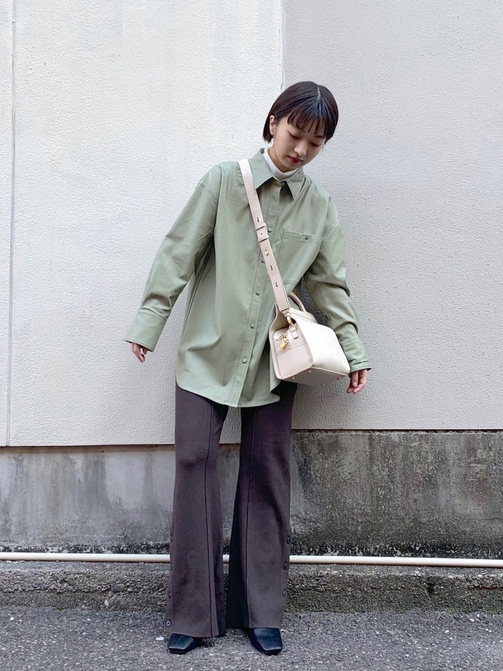ライトグリーンのレザーシャツは淡めカラーなので キメキメになりすぎずオススメです💚 長めの丈なのでニットパンツで合わせてメリハリのあるスタイルに☺️💕