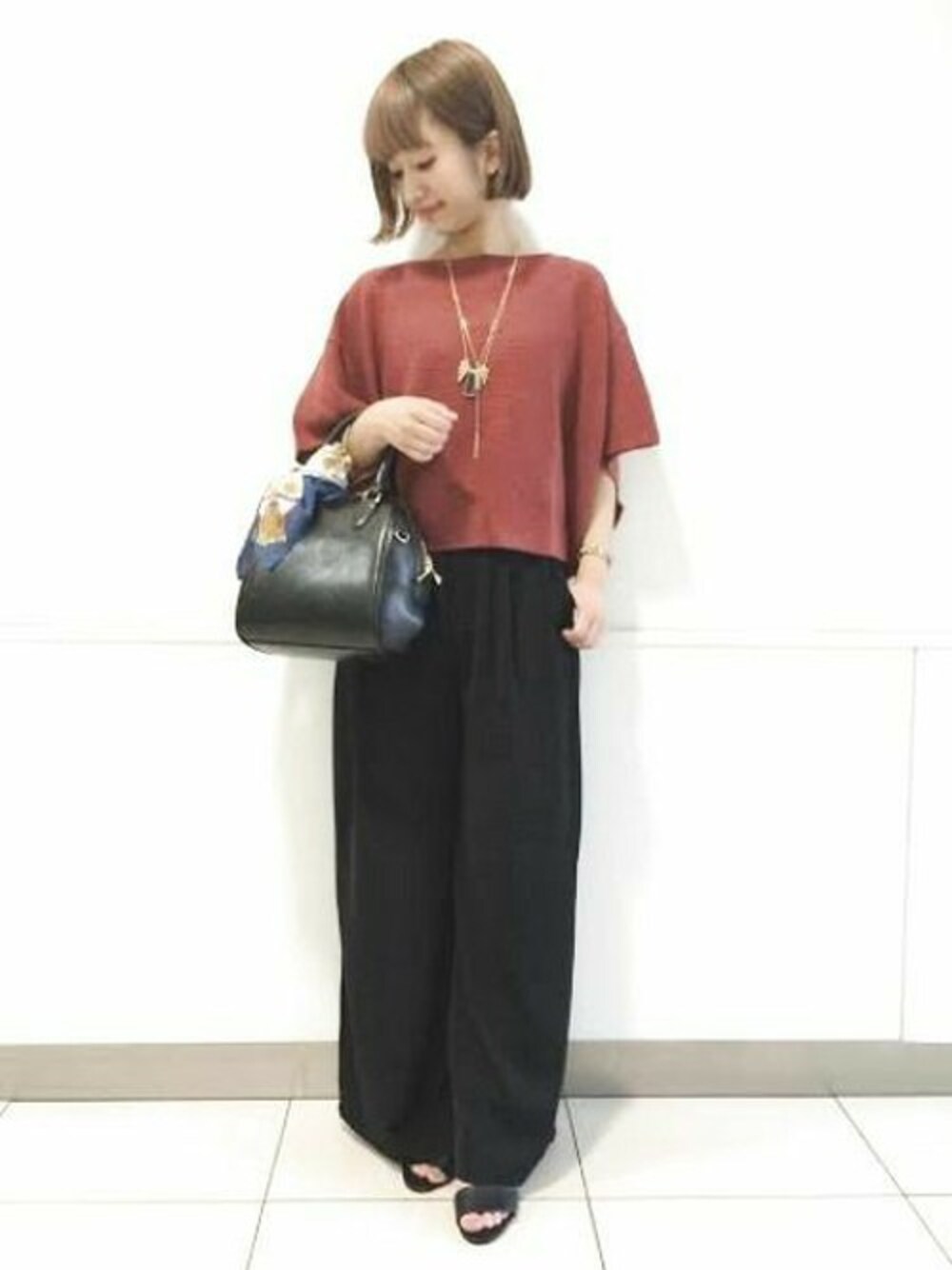 夏のトレンド色、オレンジのサマーニットは色が明るすぎず、着回し力◎です! 黒を合わせて、かっこよくコーディネートしました。 バッグにスカーフをプラスしてポイントに!