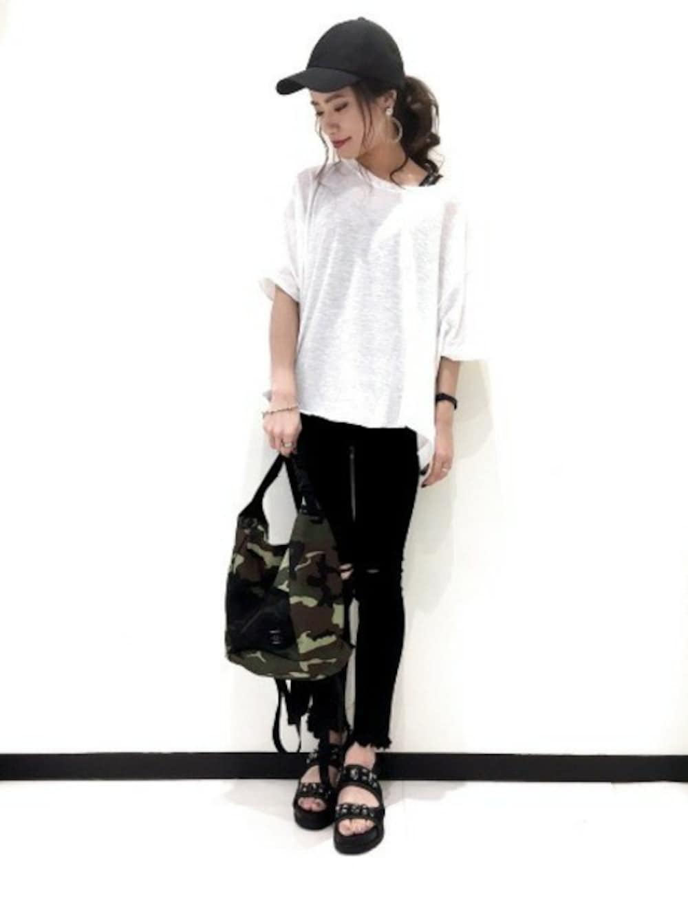 モノトーンなスタイリングも小物でカジュアルダウン! アウトドアテイストをプラスして夏らしく♪ ゆるトップス×スキニーのメリハリが◎