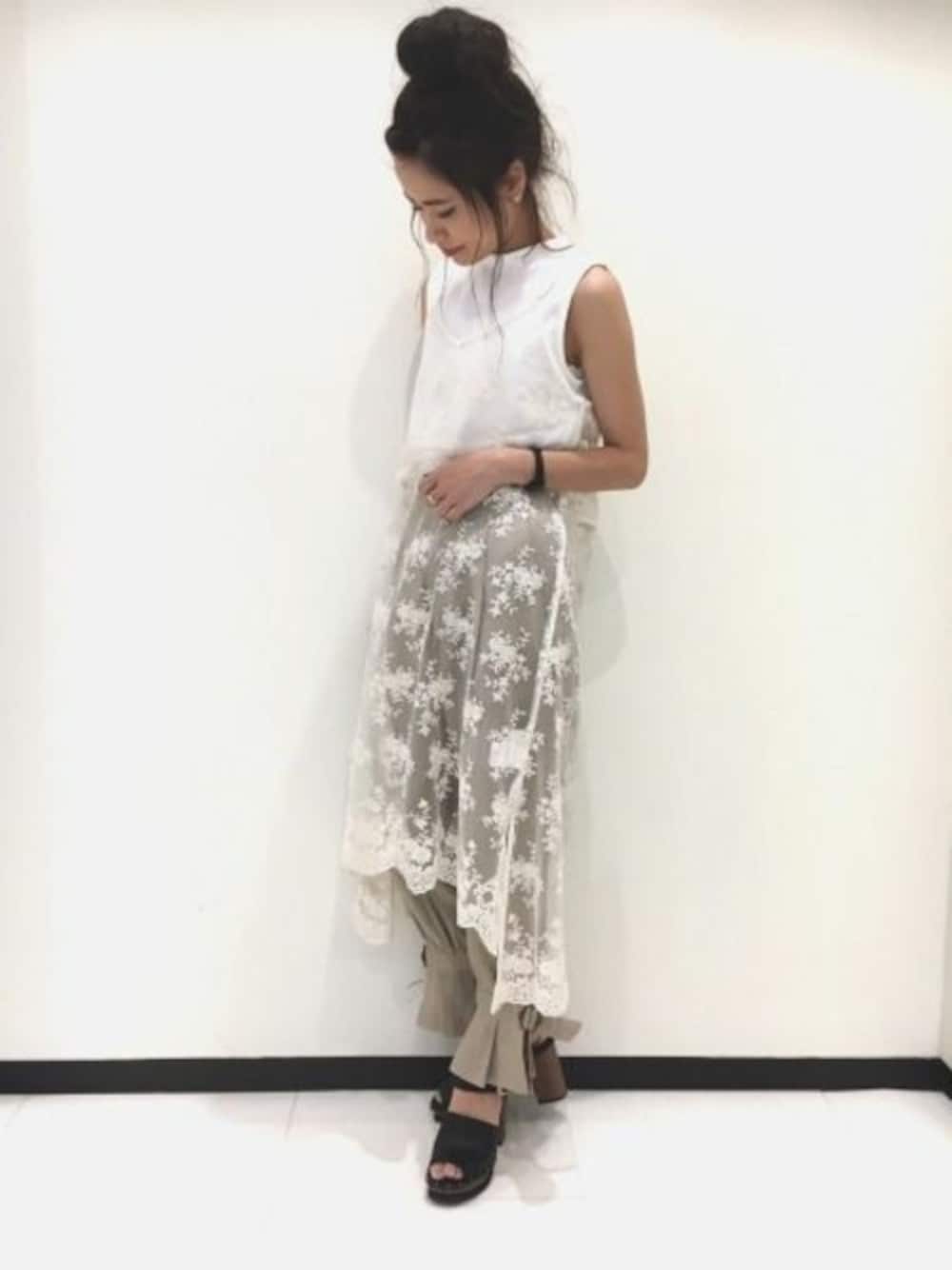 レース素材でレイヤードスタイルにぴったりの優秀ワンピ♪ リネンパンツと合わせたワントーンのリラックススタイルです☆