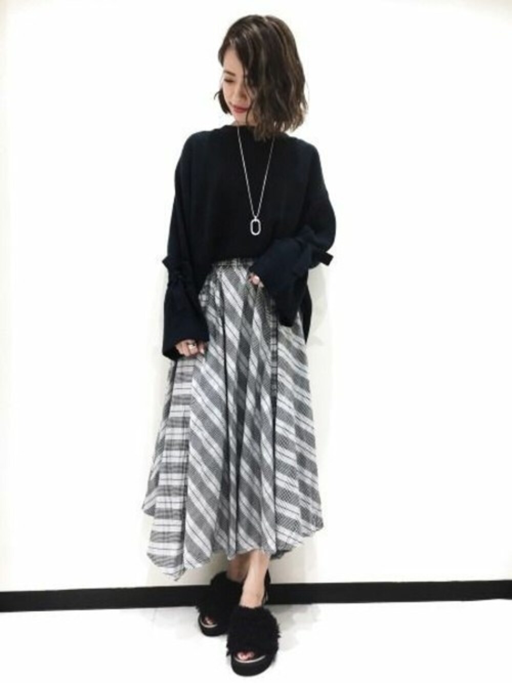 袖のリボンがポイントのニットは アシメSKと合わせてモノトーンでまとめた大人コーデに♪ チェック×ファーサンダルで今年らしさも◎