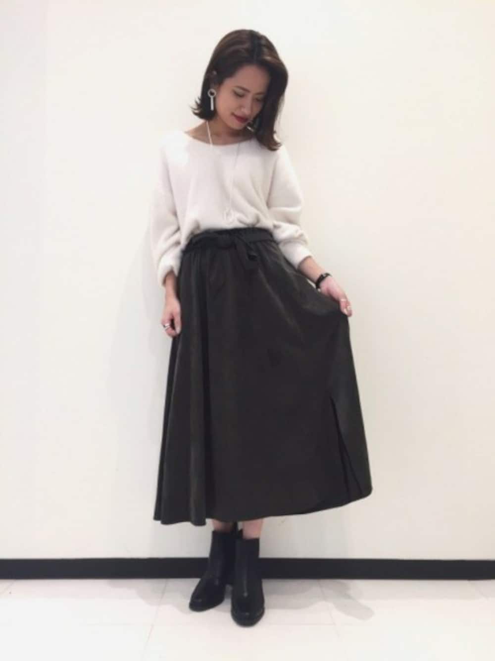 落ち着いたカーキ×スエード調のスカートには ふわふわのシャギーニットを合わせて 女性らしさをプラス♪