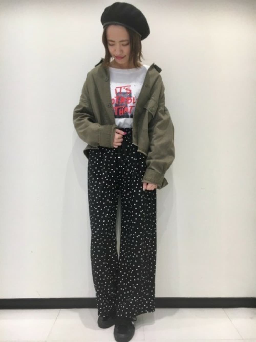 ミリタリージャケット×ドットパンツの カジュアルスタイル! プリントの赤がほどよくアクセントになって コーディネートが引き締まります☆