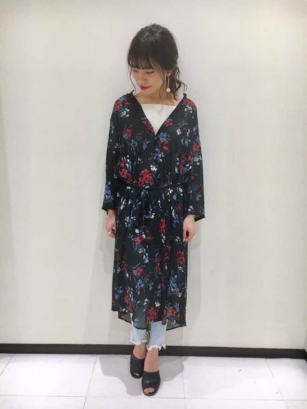 花柄ワンピースをブラウジング&スキニーとレイヤードして こなれ感のあるスタイリングに♪ 首元をあけると夏らしくスッキリします◎