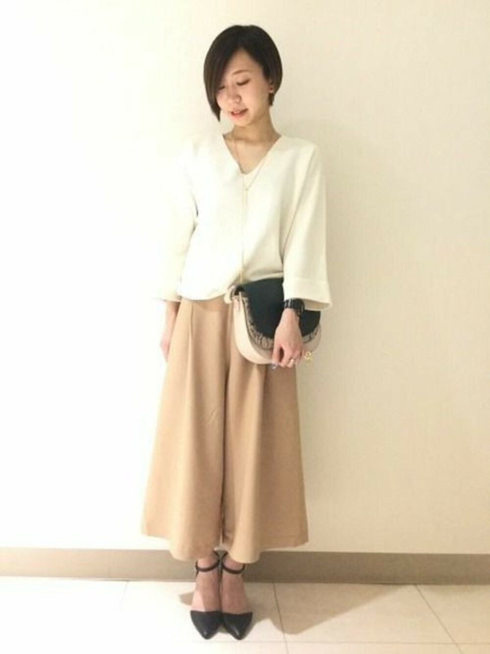 シンプルなVネックニットを今年流行のスカーチョで合わせて大人かわいく!足元をパンプスで合わせていただければ通勤時でも使えるくらいきれいにまとまります♪