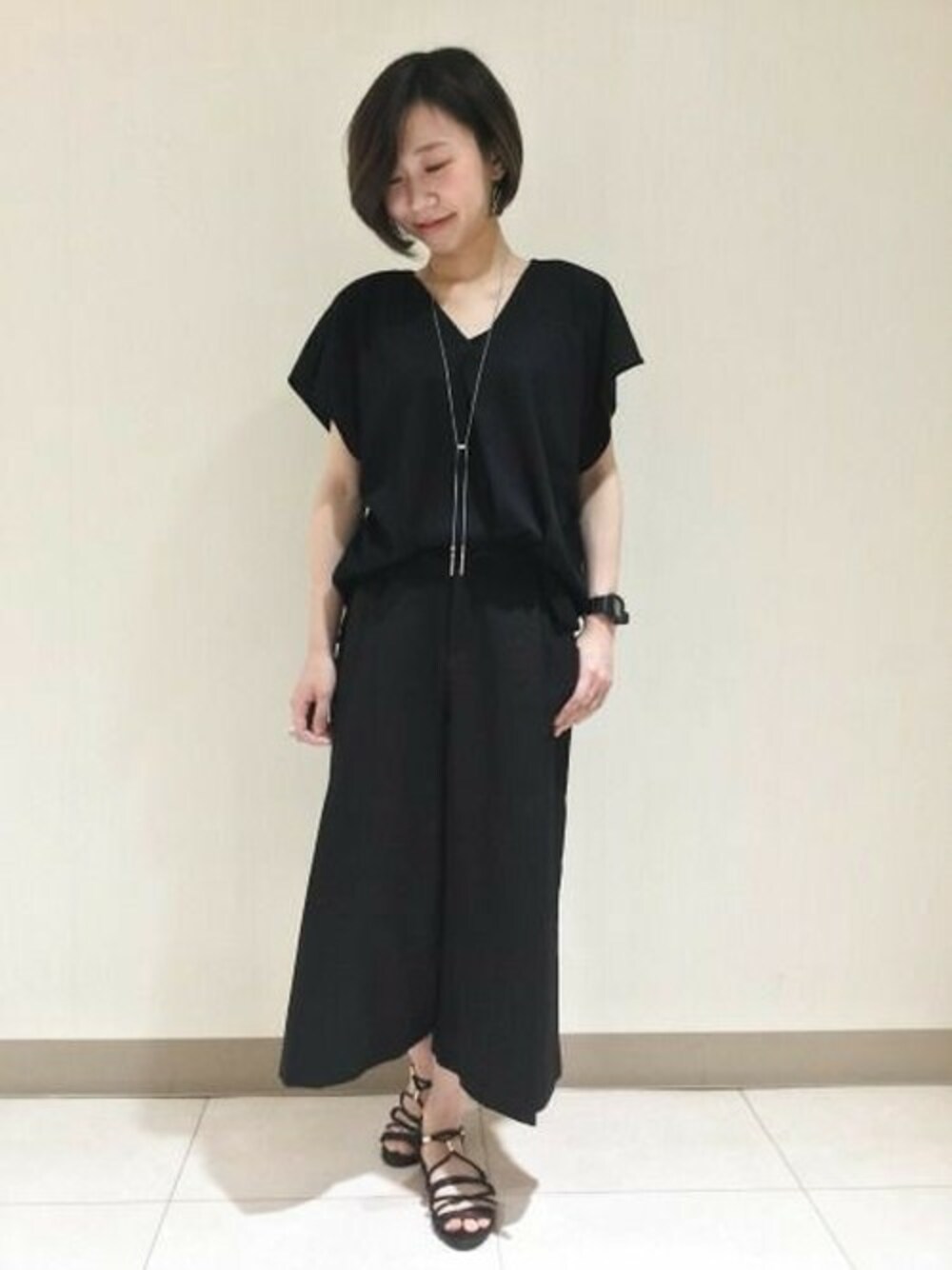 オールブラックコーデには適度な肌見せがポイント☆ 足元はレースアップサンダルを合わせて、シルバーアクセで涼しげな印象で。