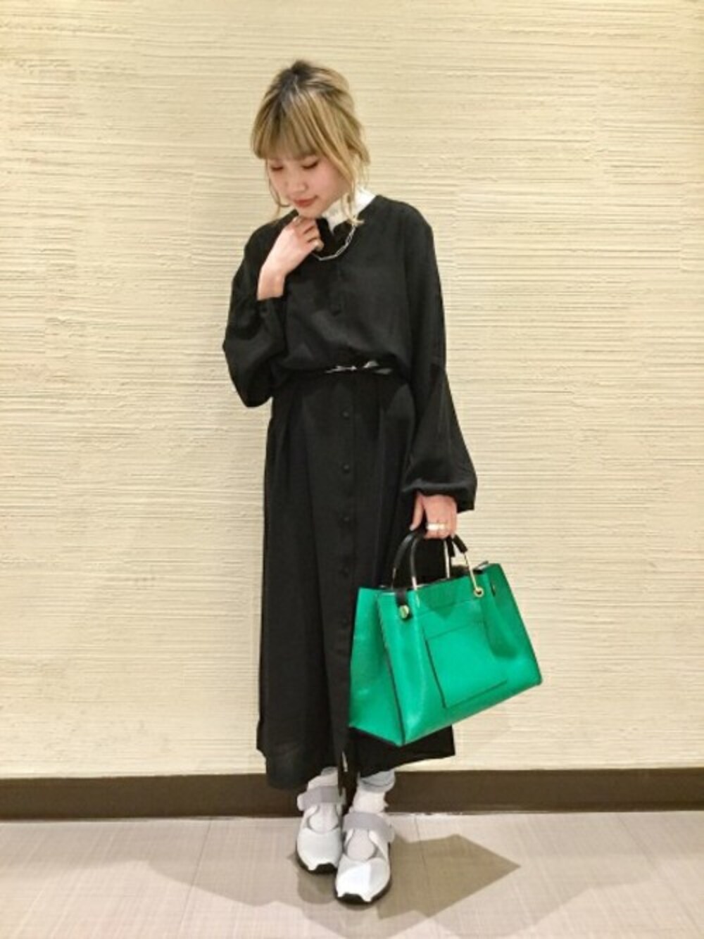シンプルなブラックワンピには ツケエリを重ねて、個性的なBAGと スニーカーをプラス! シンプルだけどオシャレに見える 簡単コーデです☆