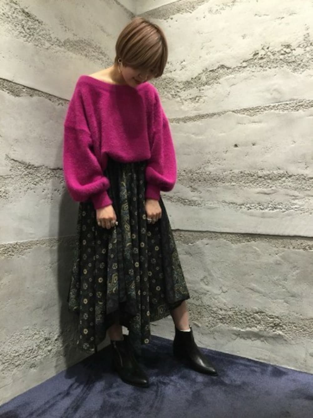 目を惹くピンクのトップスに、アシンメトリーのスカートを合わせました♪ 色物と柄でも合わせ方によって、派手になりすぎずに着られます☆