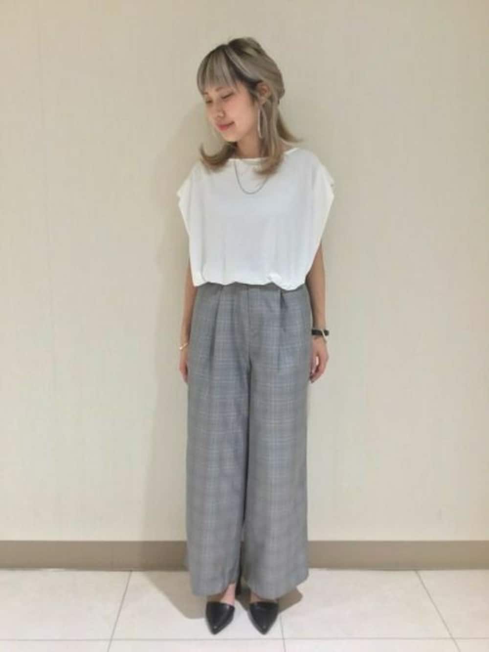 シンプルなトップスにグレンチェックのワイドパンツを合わせて英国風にまとめました!モノトーンなコーディネートは普通になりすぎないようチョーカーを合わせるのが今年らしいです♪