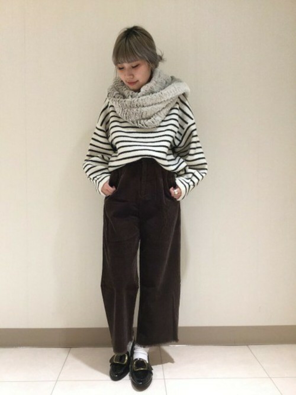 定番のボーダートップスにはコーデュロイパンツでトレンド感を取り入れました!首元のスヌードで柔らかさもプラスしてボーイッシュになりすぎないように☆