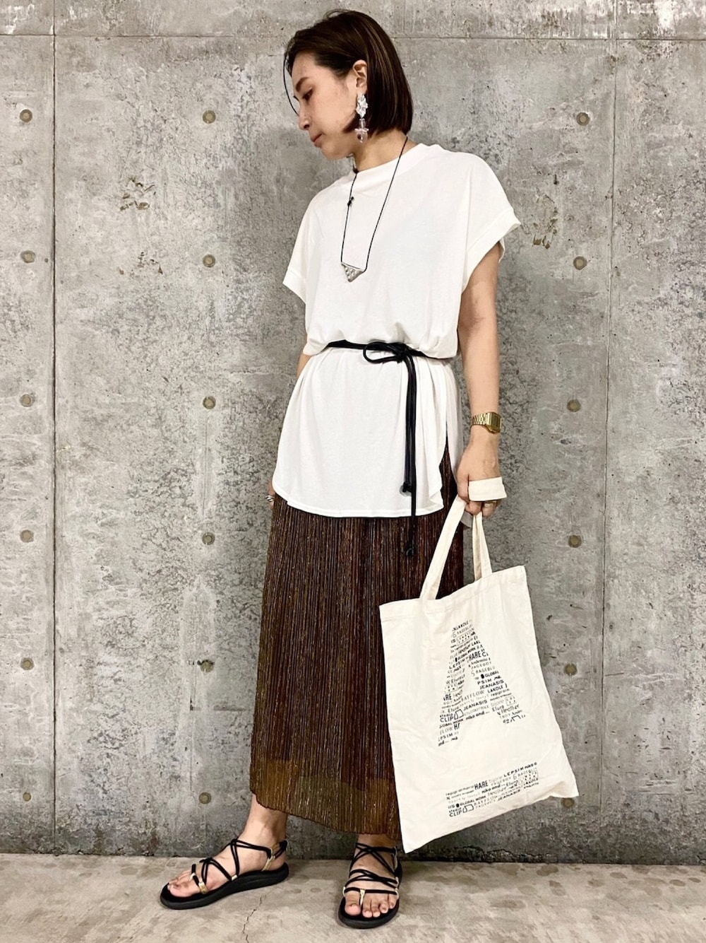 キラキラのスカートメインにシンプルに合わせました♪ . . カラーライナーで目元にちょこっとアクセントとするのが夏気分! . インスタイルに飽きたのでウエストマークできゅっとするのが◎