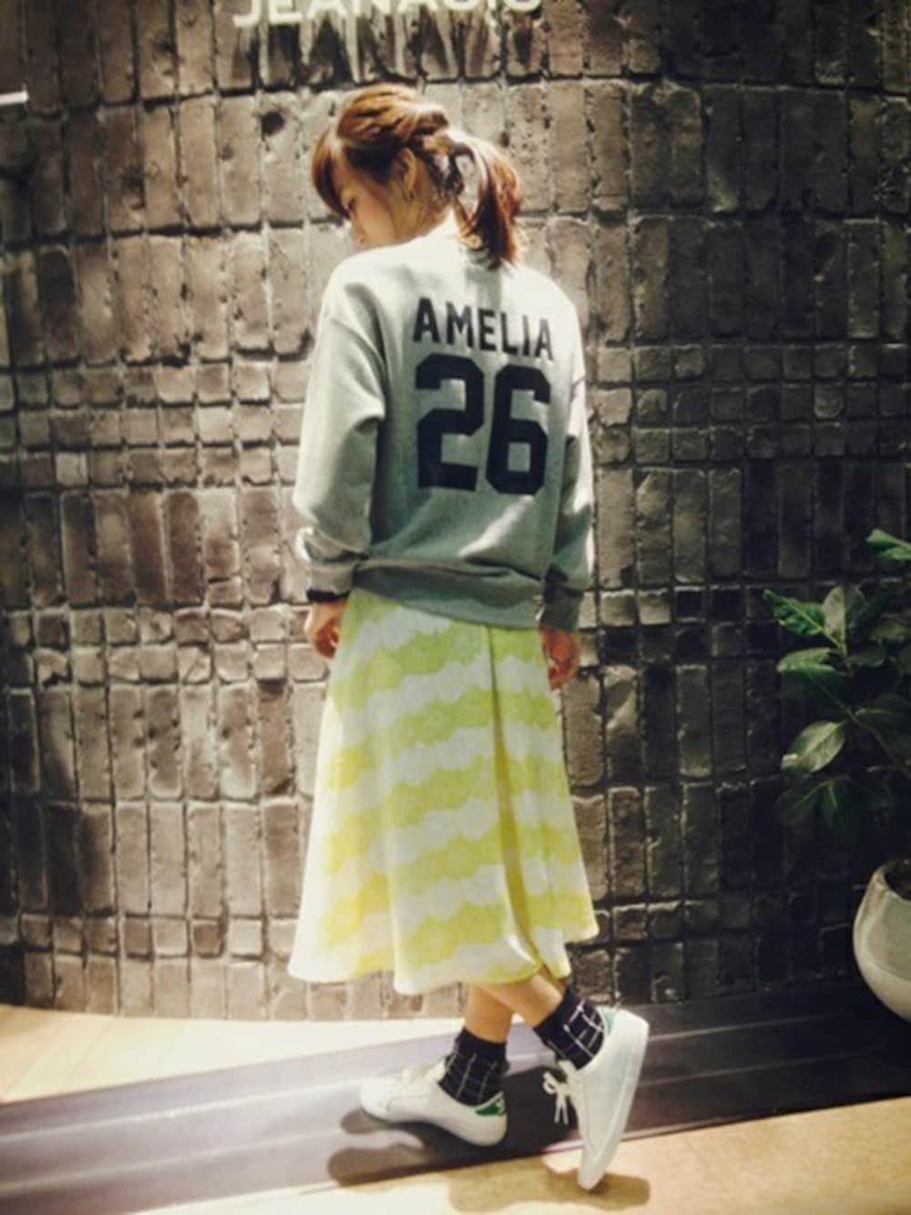 ナンバリングのバックプリントがインパクト大のスウェットです◎ ミモレスカート&スニーカーでガーリーに着こなしました! ゆったりとしたシルエットなので、スキニーとの相性も★